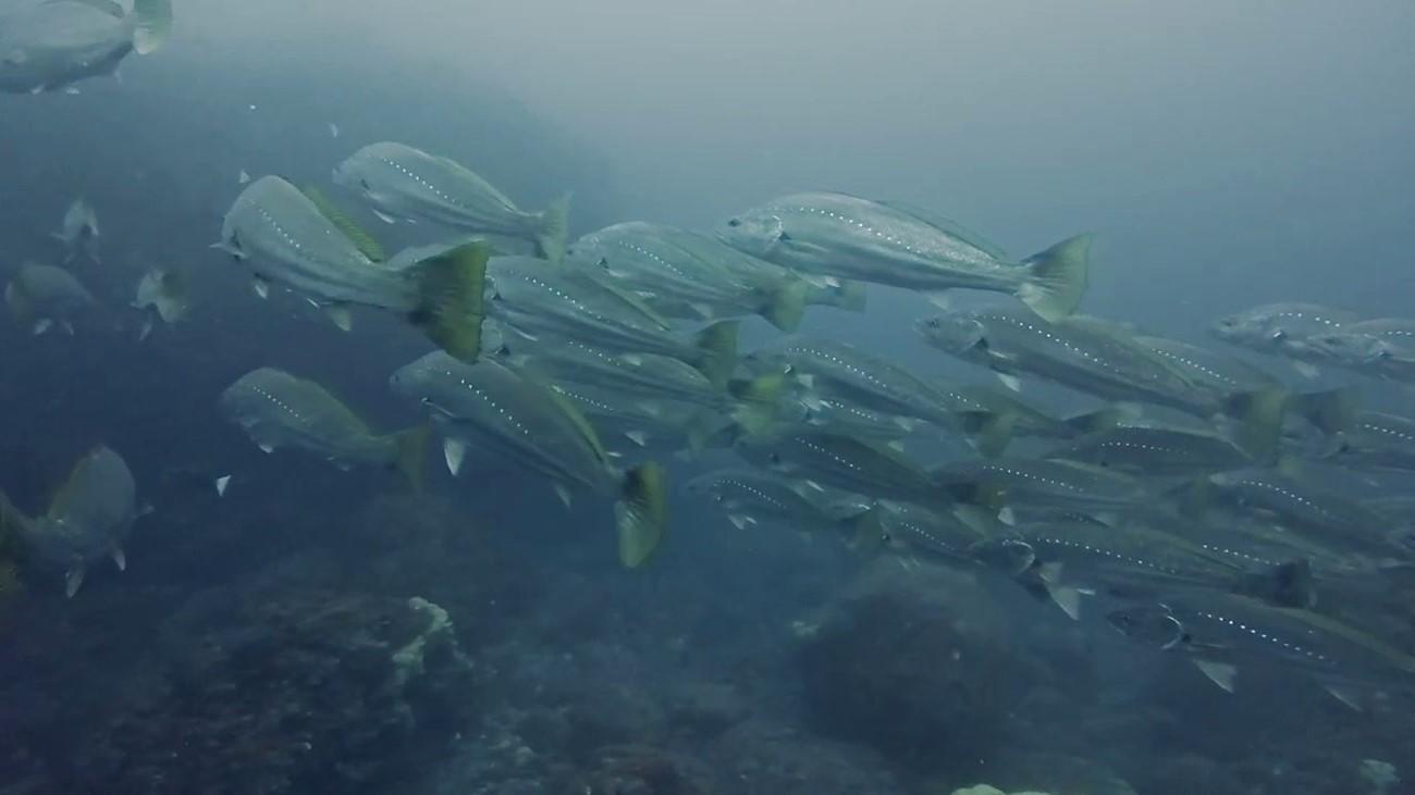 オオニベ群れも大群れとなって大移動。大きなキハダマグロの群れ。タカベ大玉やイサキの群れ、タカサゴの群れやメジナの群れ、ニザダイの群れやムロアジの群れなども魚影が濃かったです。シラコダイが爆群れ中で魚影ファンの方に見てほしい光景です。