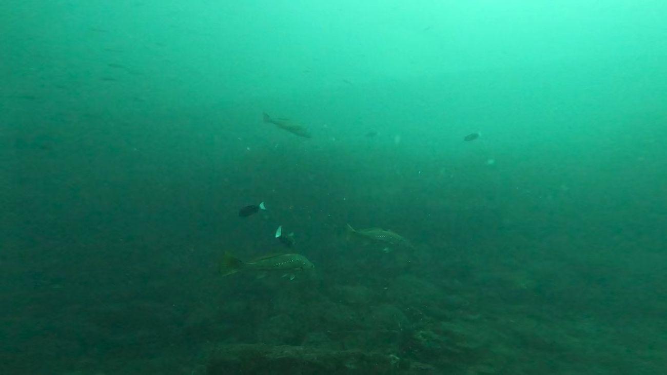ヒラマサがビュンと横切ったり、下方には大きなオオニベがギラリと群れています。
