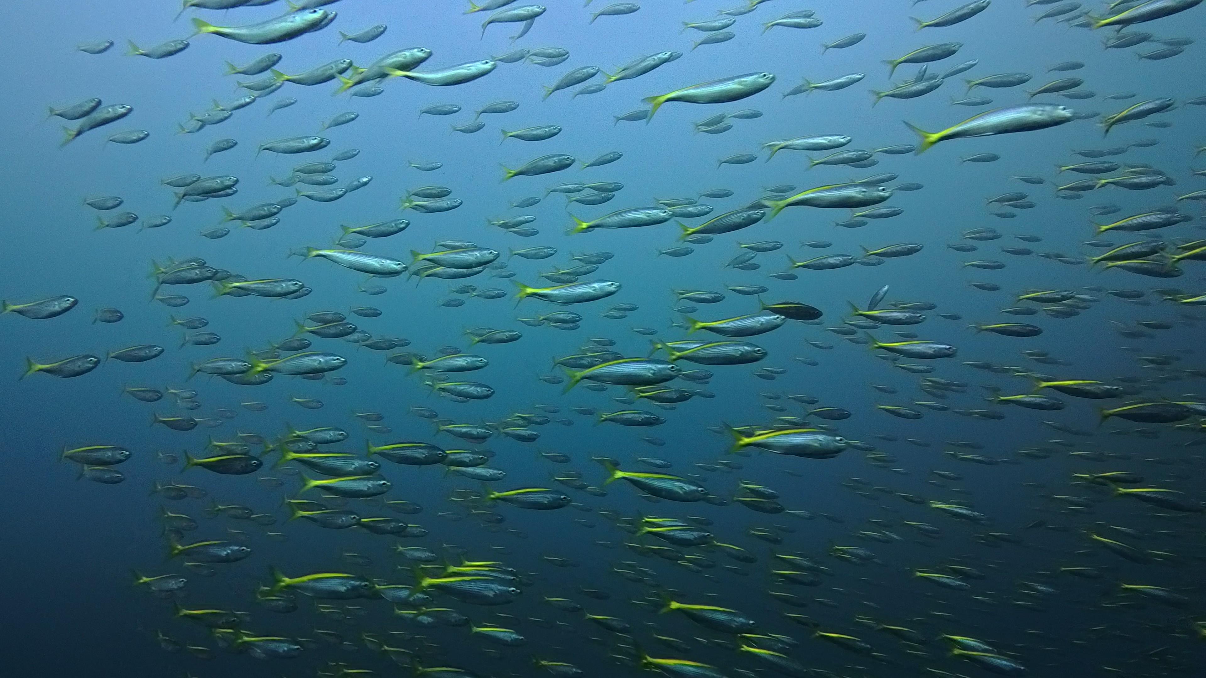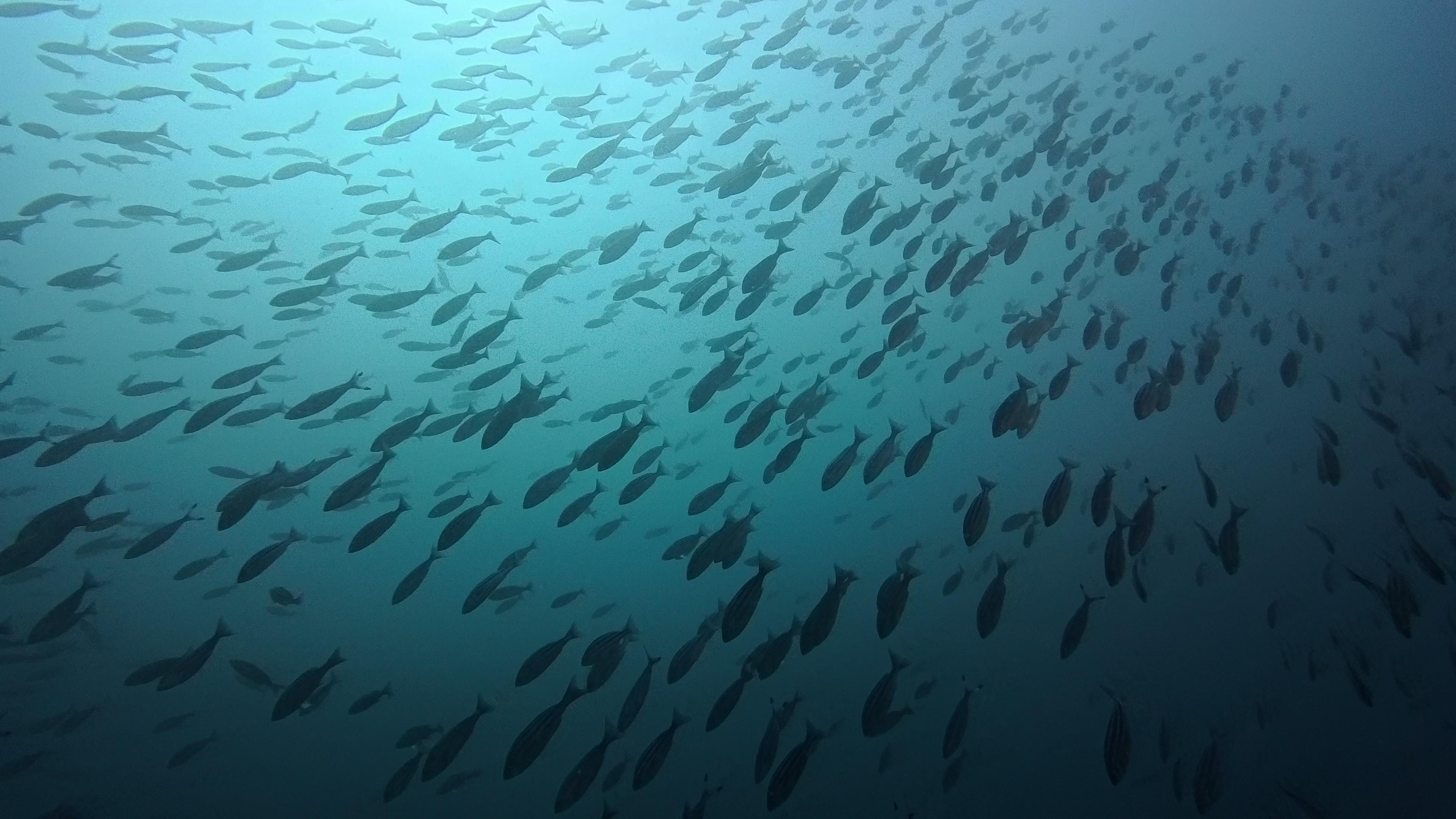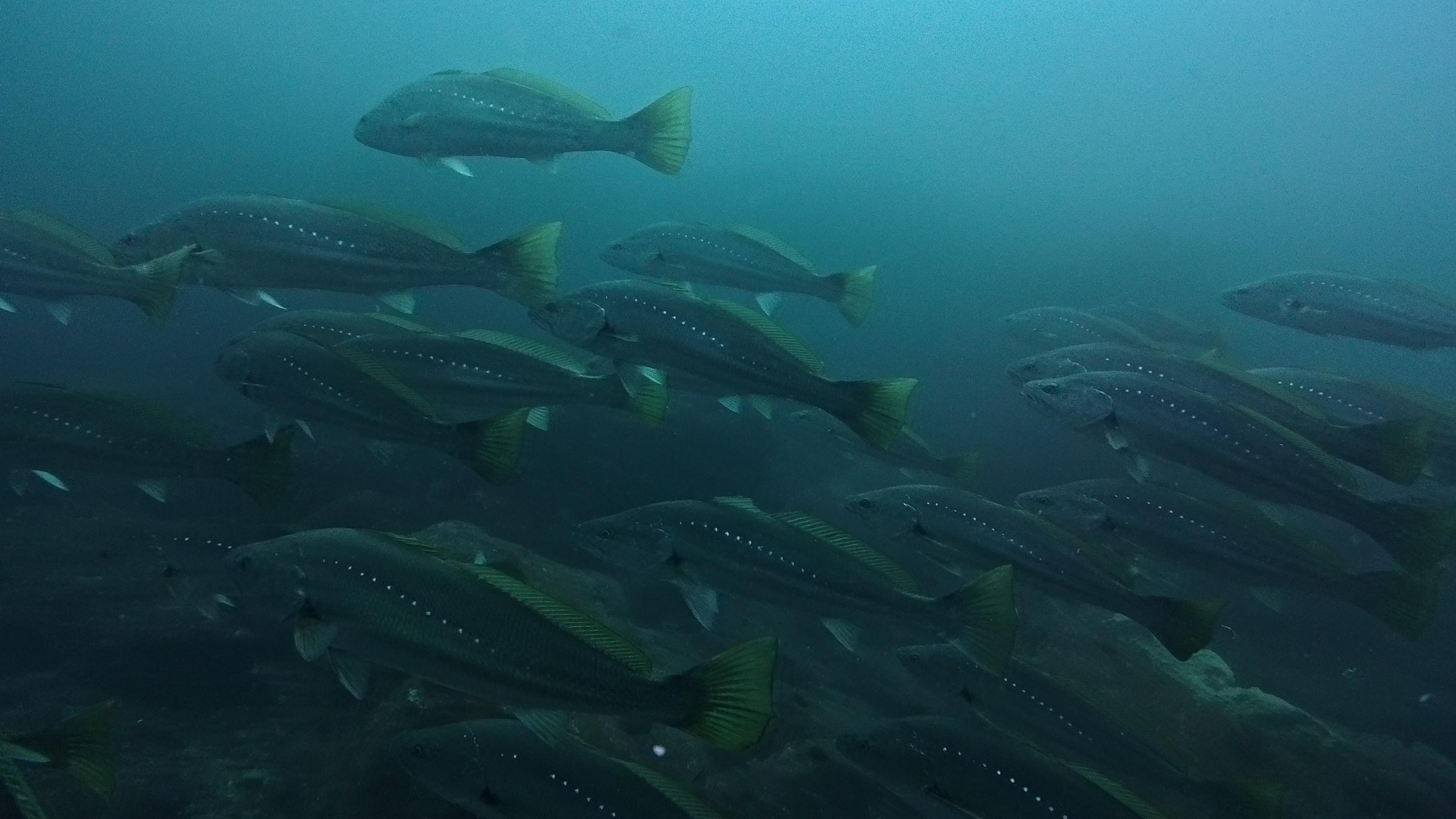 イサキ、タカベ、ムロアジ、タカサゴ、メジナが至る所で群れています。