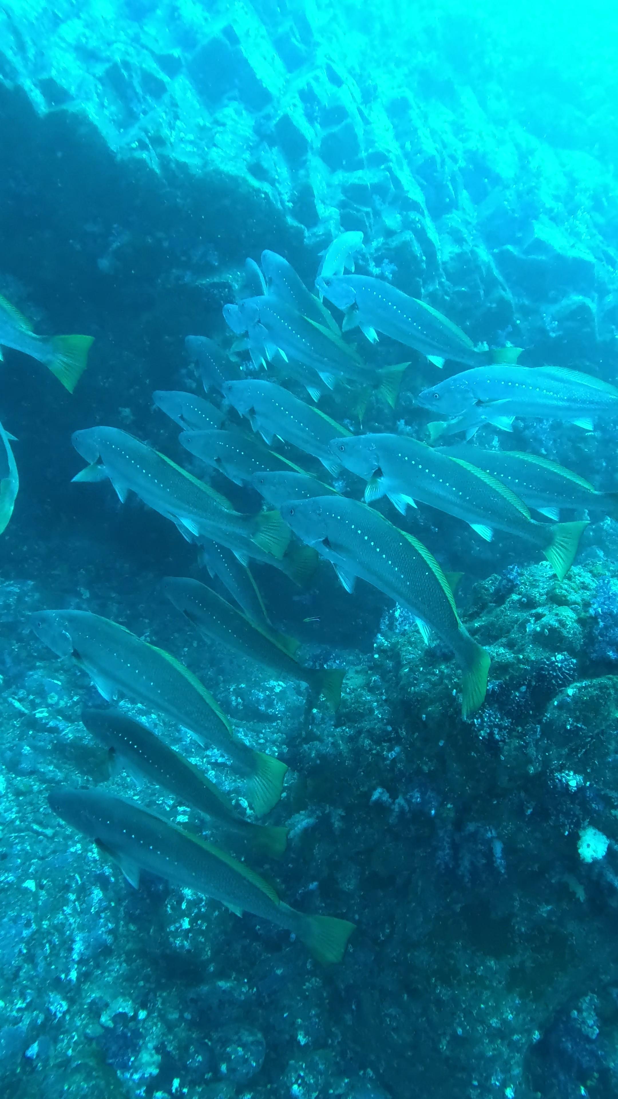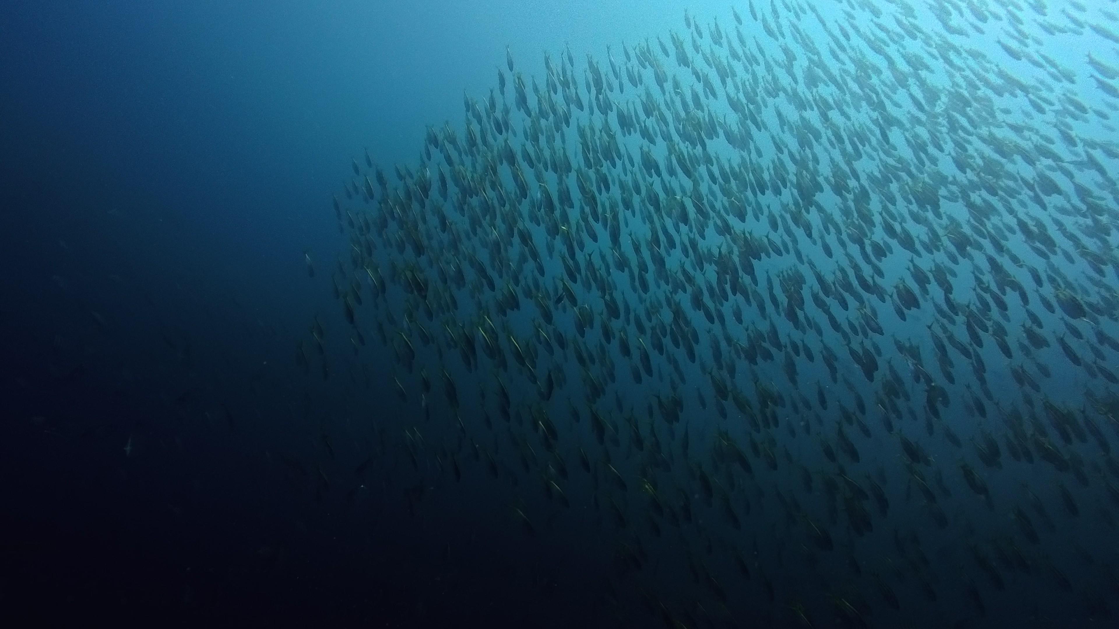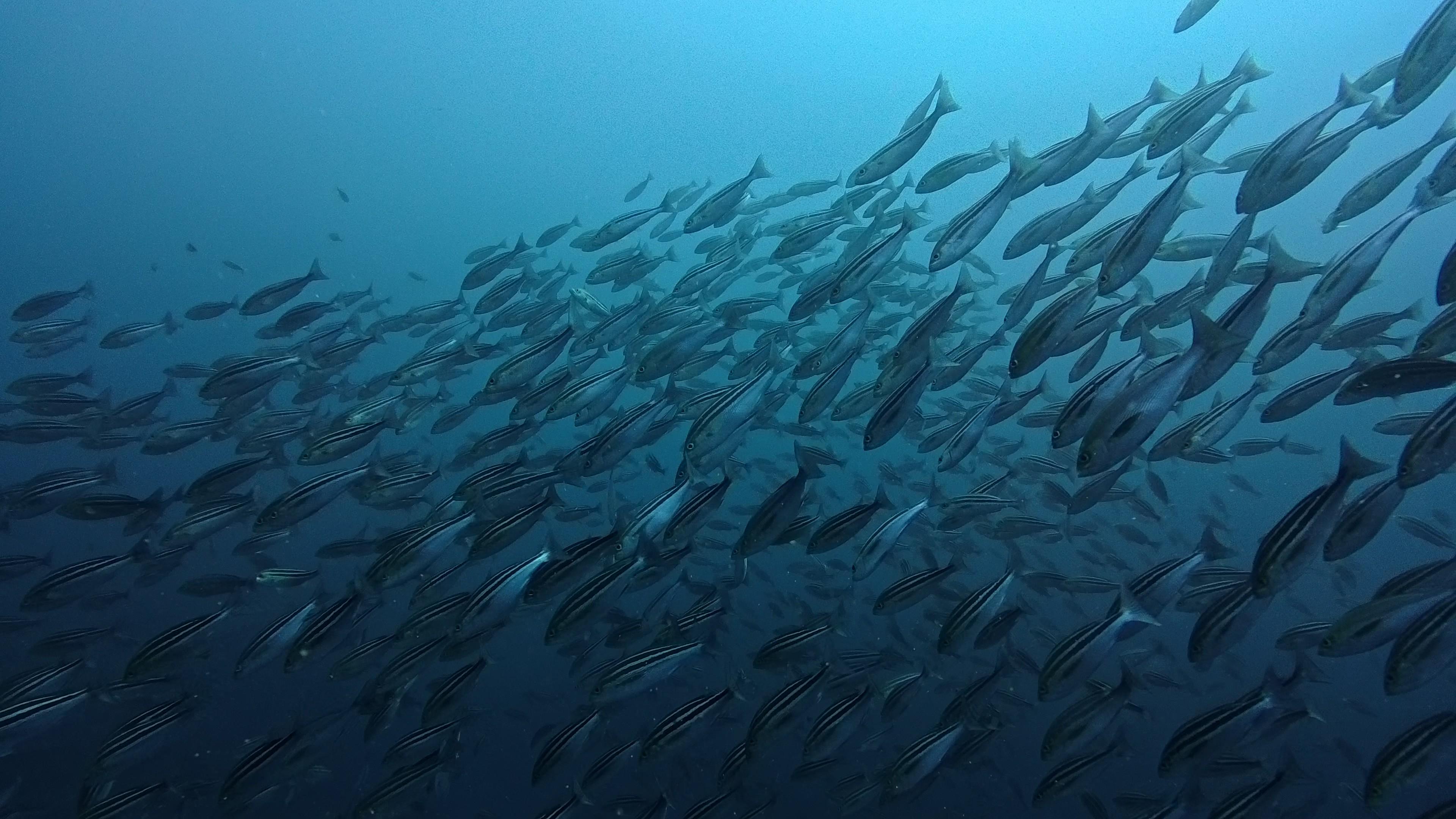 流れにのって行くと、タカベの群れはこちらに次々と向かってきたり、キラキラと降り注いできたりと、