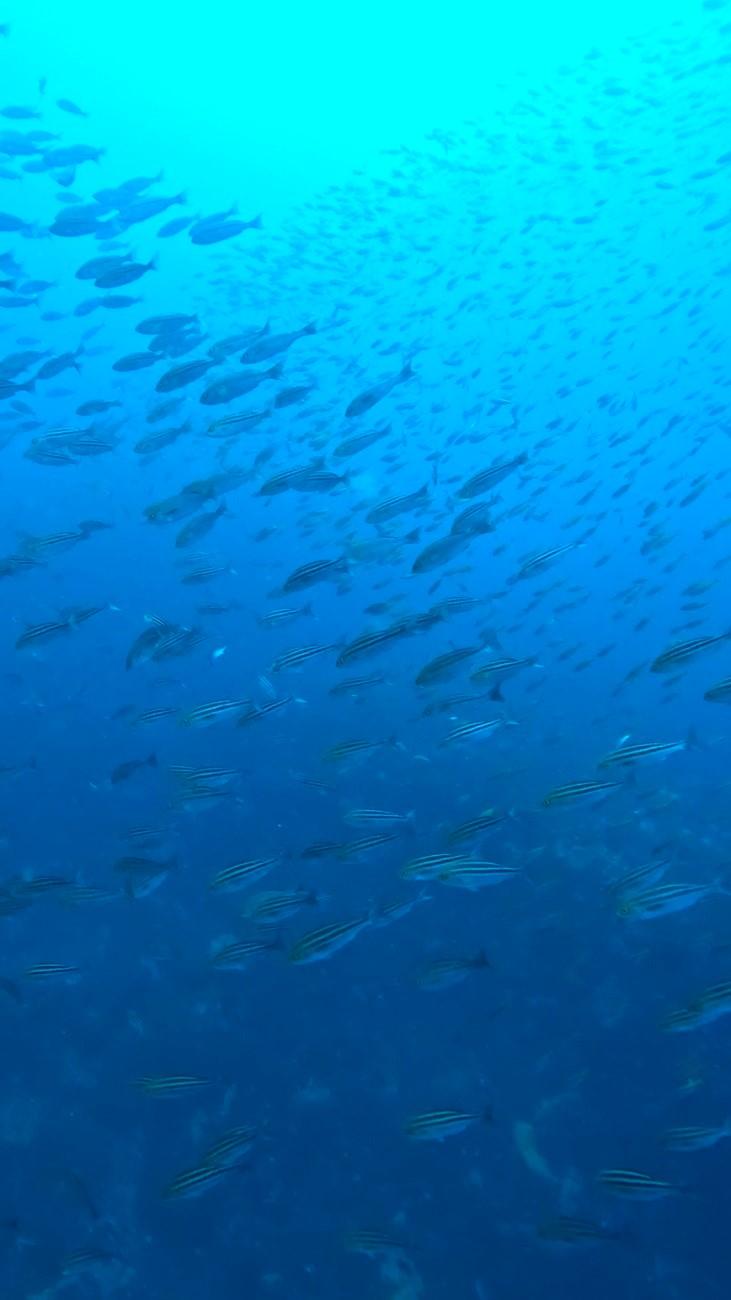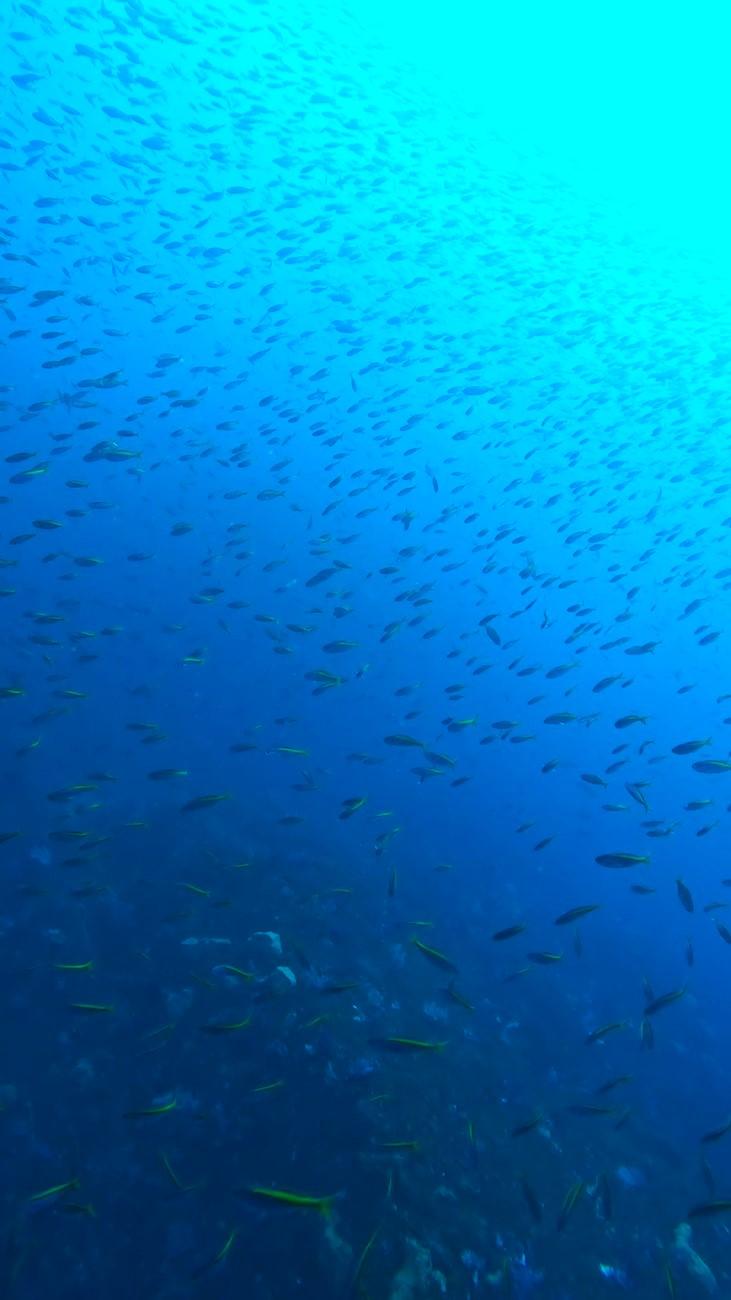 青い海を期待しましたが、白さが目立った水中でした。黒潮が離れているということもあり潮は強烈な上げ潮。いずれの2本も潮陰の西側を中心に潜りましたがハンマーは厳しかったです。それでも魚影の濃さはさすが神子元島の水中。