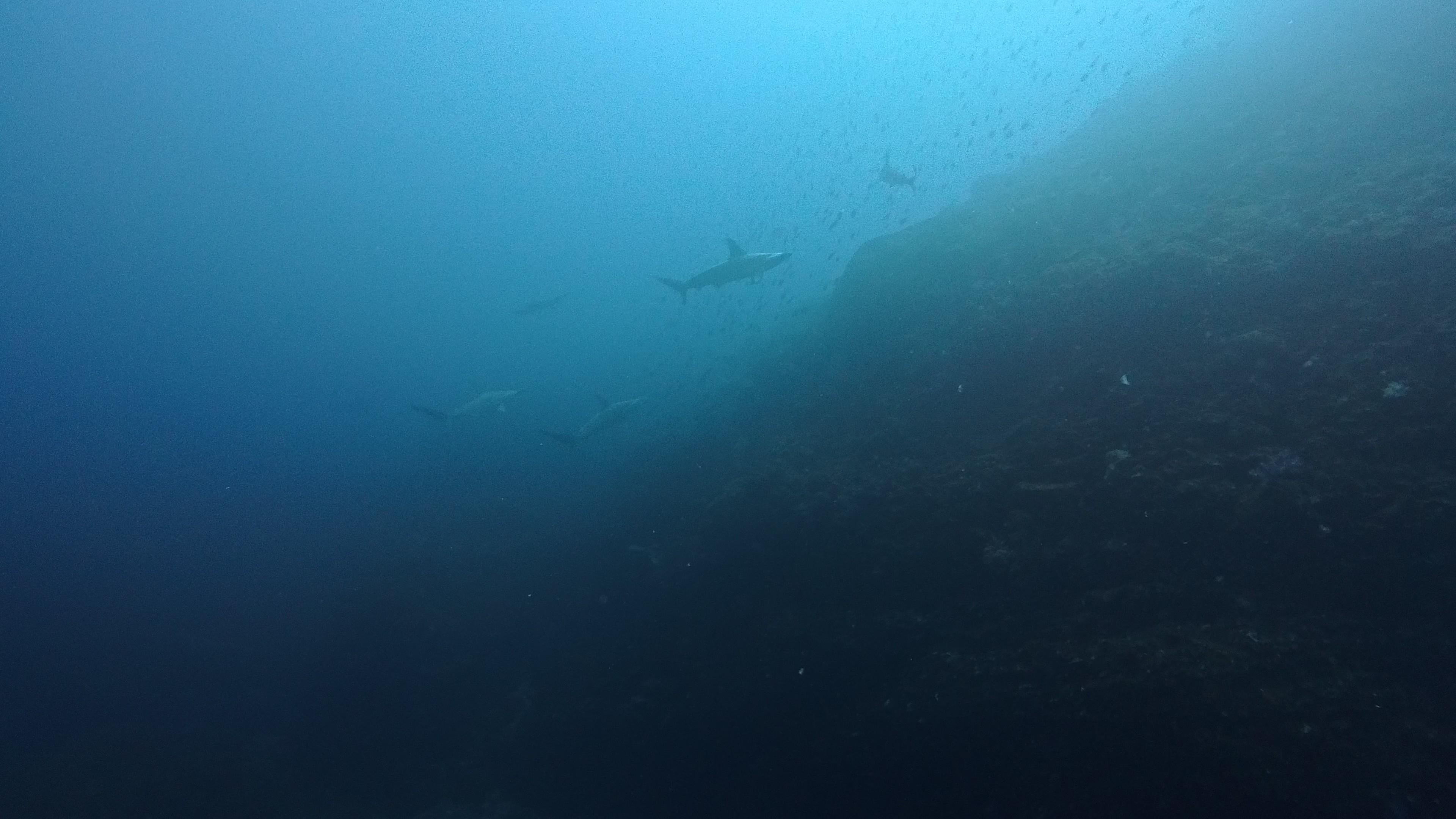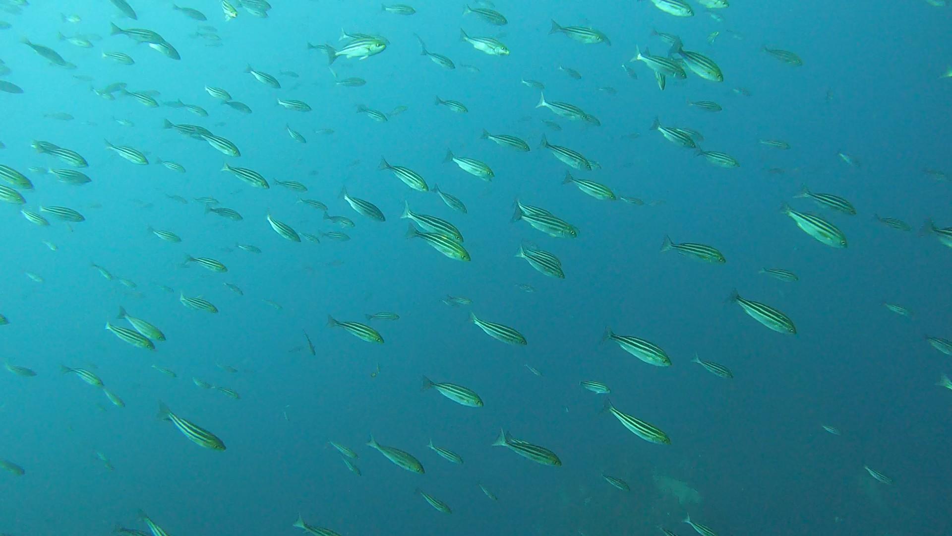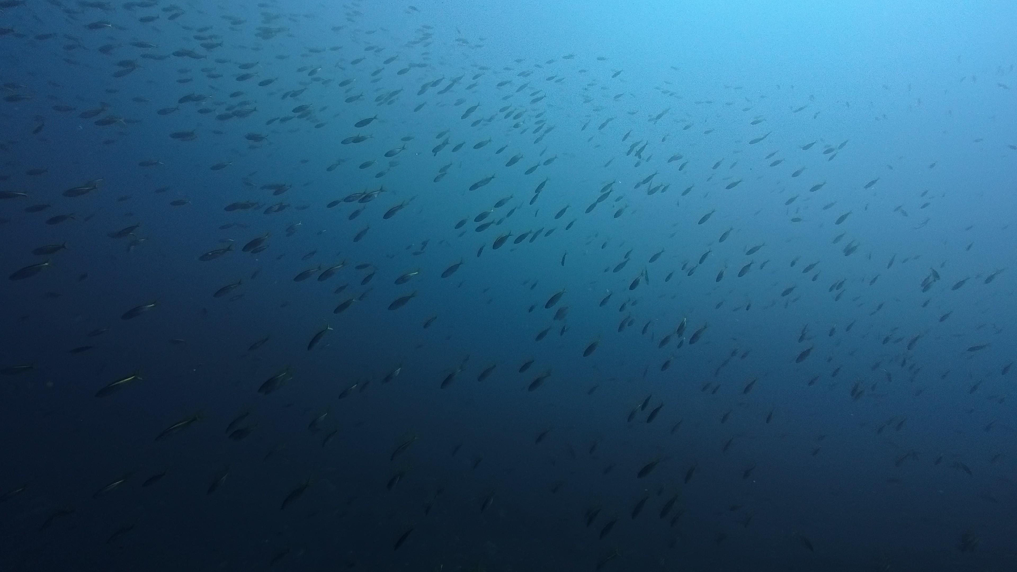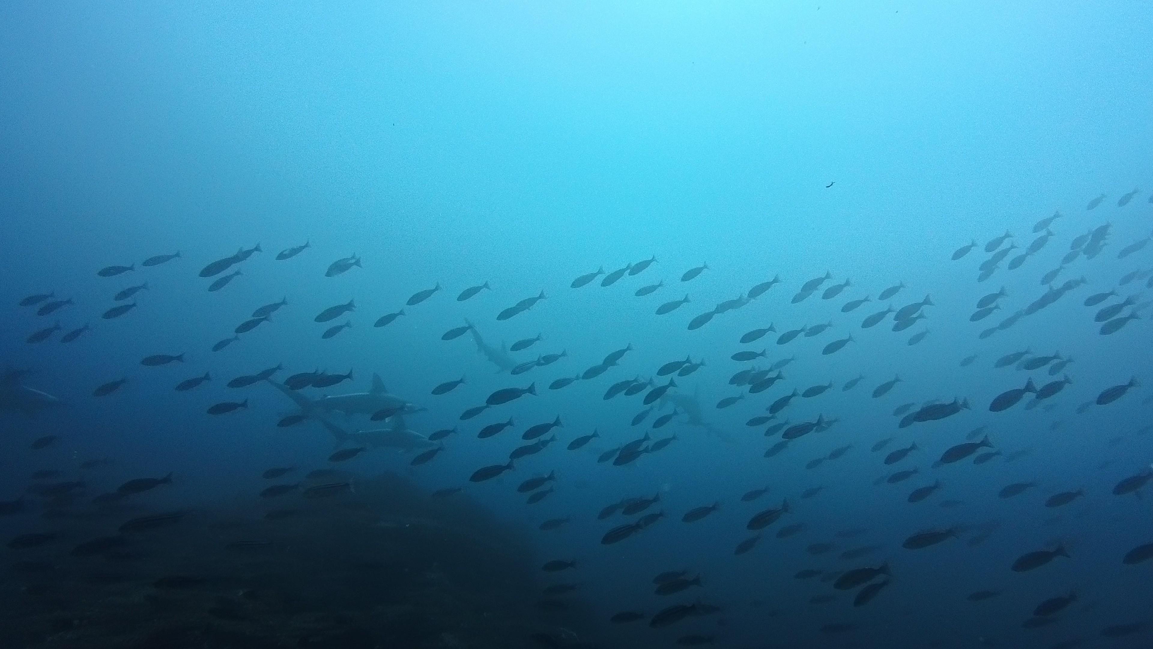 また、頭上をうろうろするメジロザメ、一帯を覆うオオニベの群れ、後半ずっと降り注ぐタカベの群れなど、