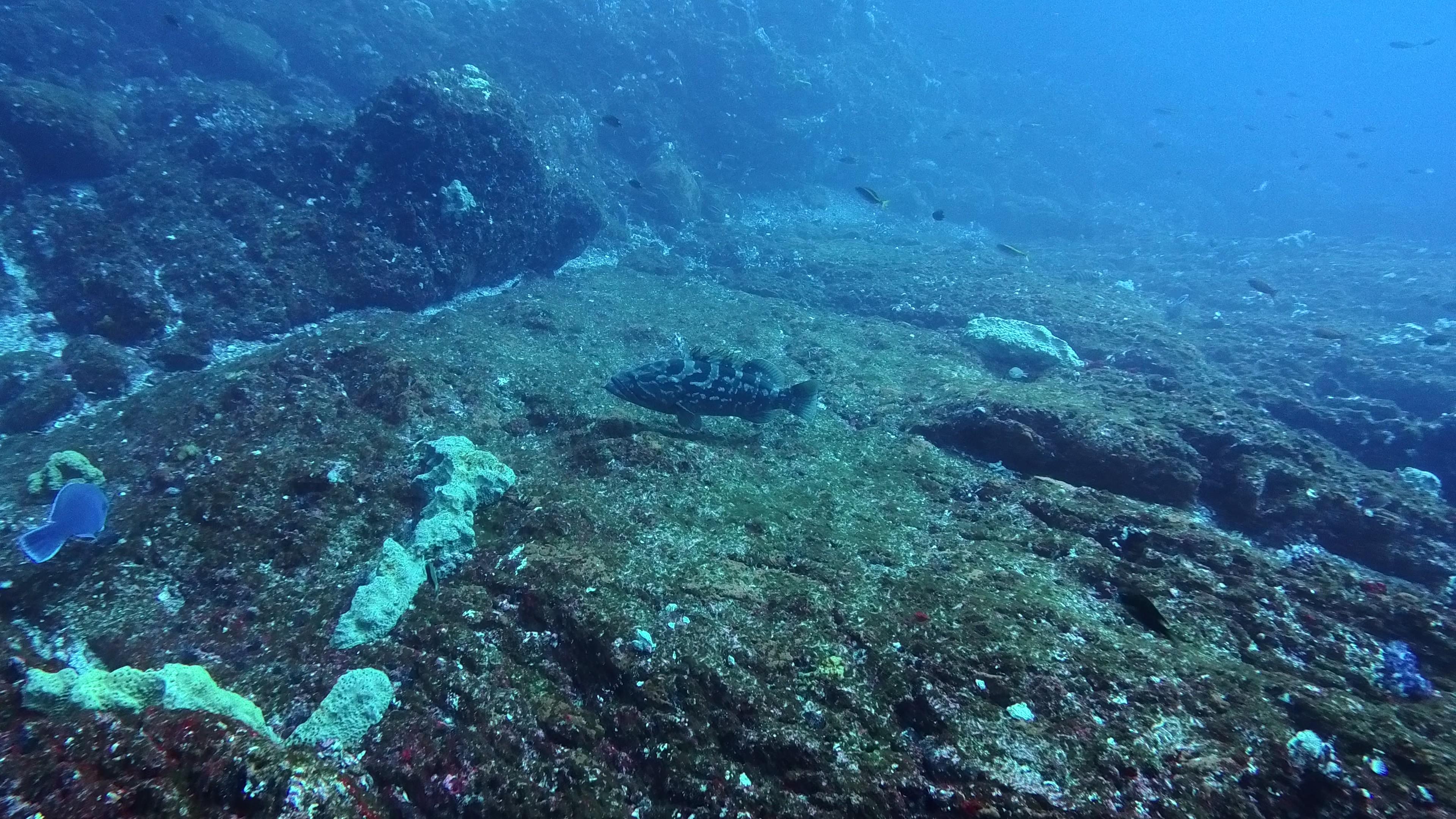 根周りはイサキ、タカサゴ、メジナ、ニザダイ、シラコダイなどたくさんの魚が群れ、
