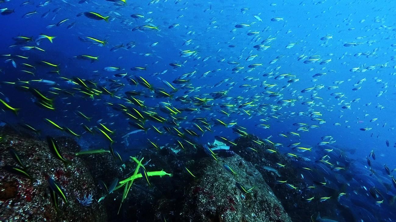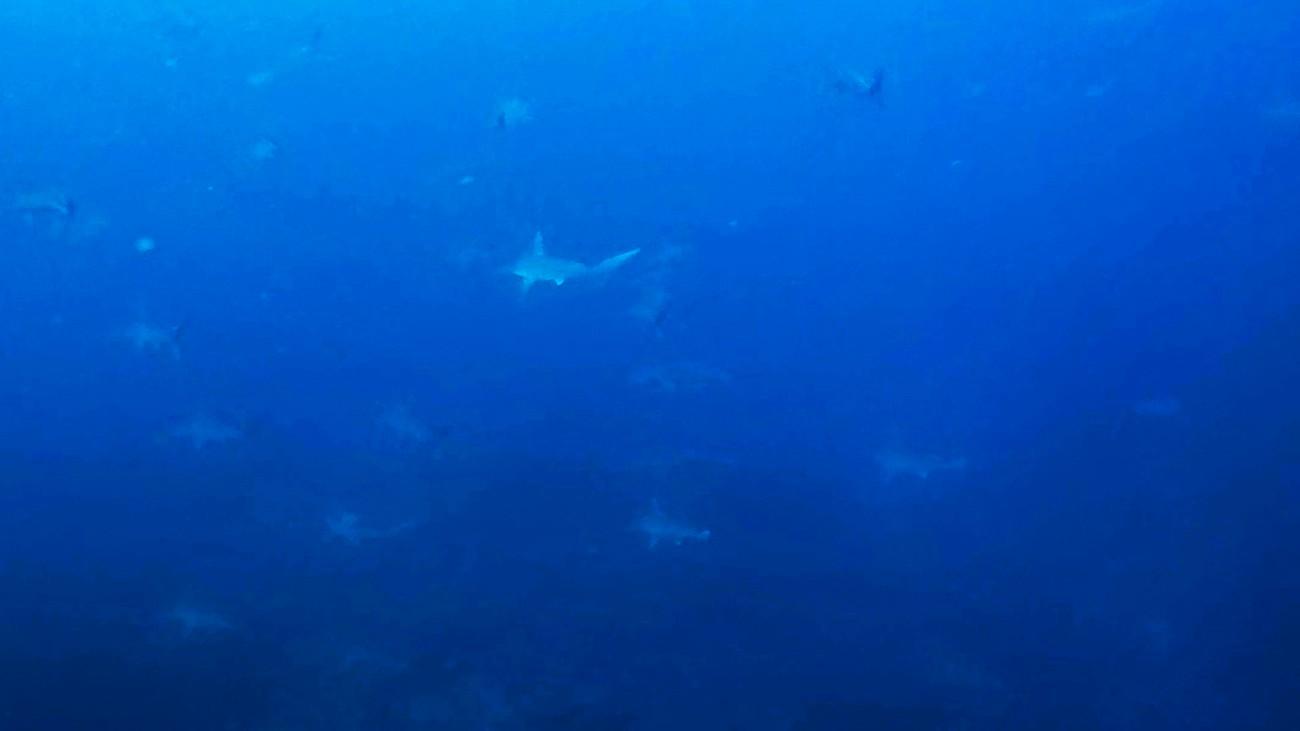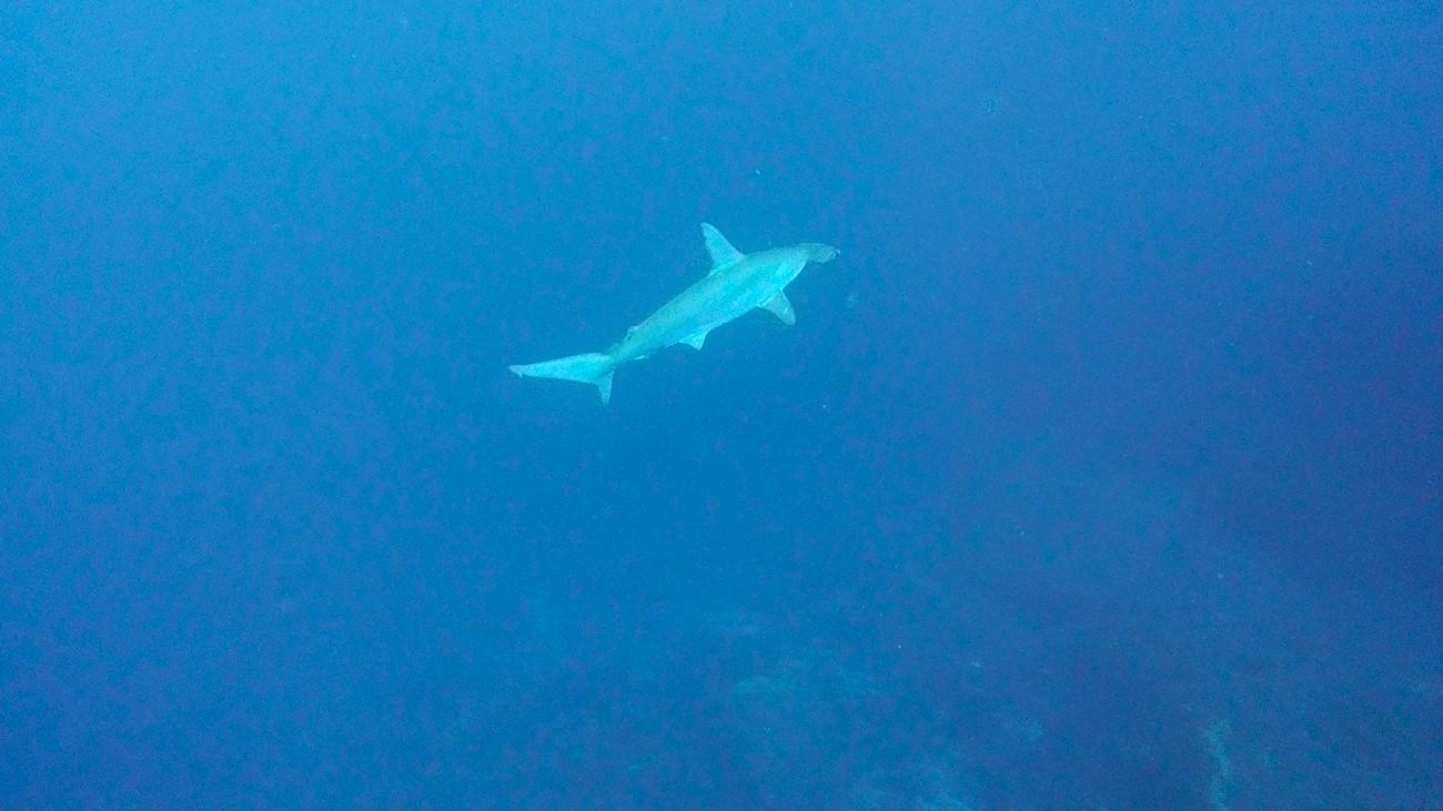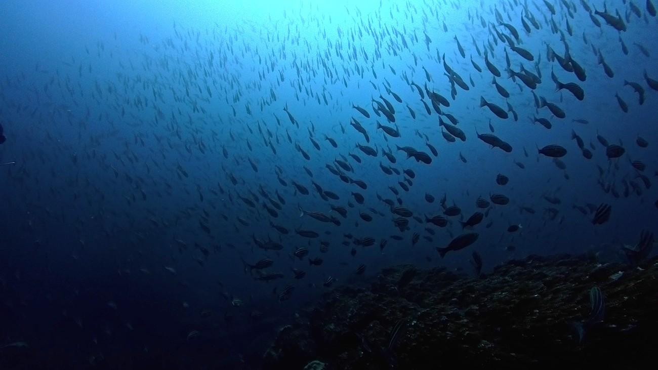 青い海を期待しましたが、透視の白さ加減は普段通りの水中。やはり黒潮が離れているということもあってまだまだ満足させてくれない神子元島です。それでもハンマーの群れは健在。遠くて寄ることはできませんでしたが、存在確認はできました。そして何といってもオオニベの群れが見王見応えありました。シマアジの大群れも見応えありで、魚影の濃さもさすが神子元島といった水中でした。