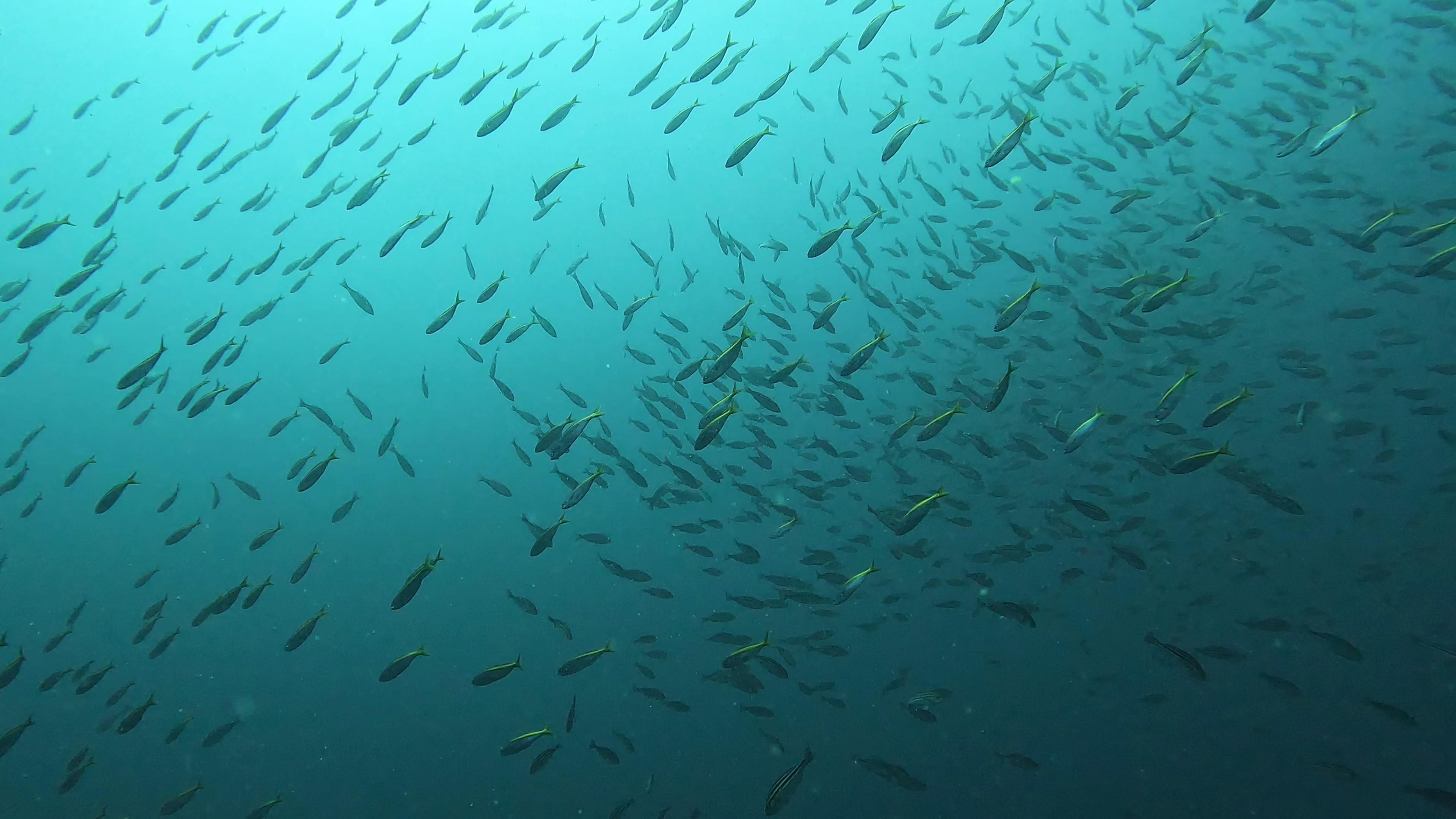 目の前を縞々のイサキの群れが横切り、タカベの群れはキラキラと降り注ぎ、