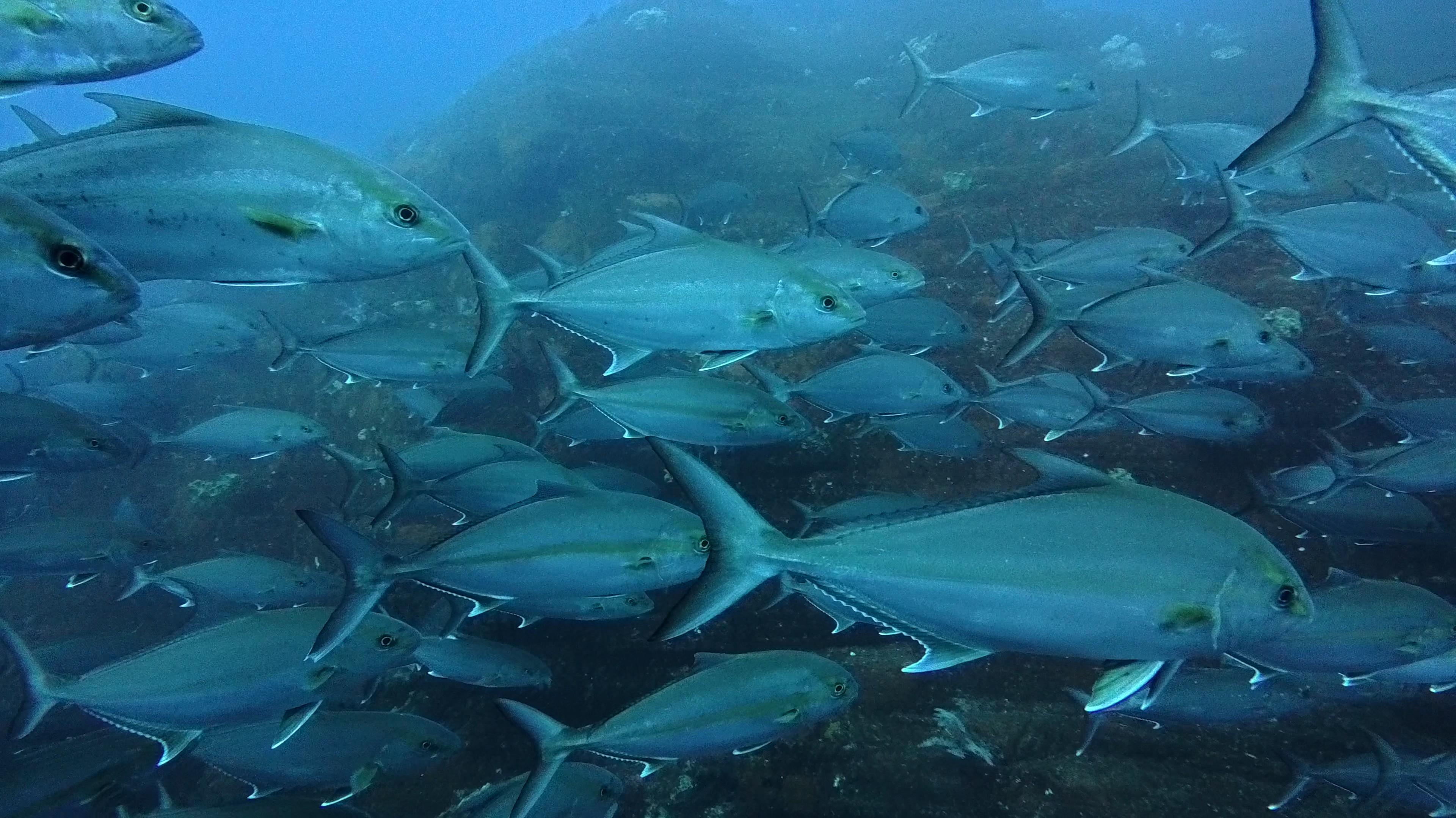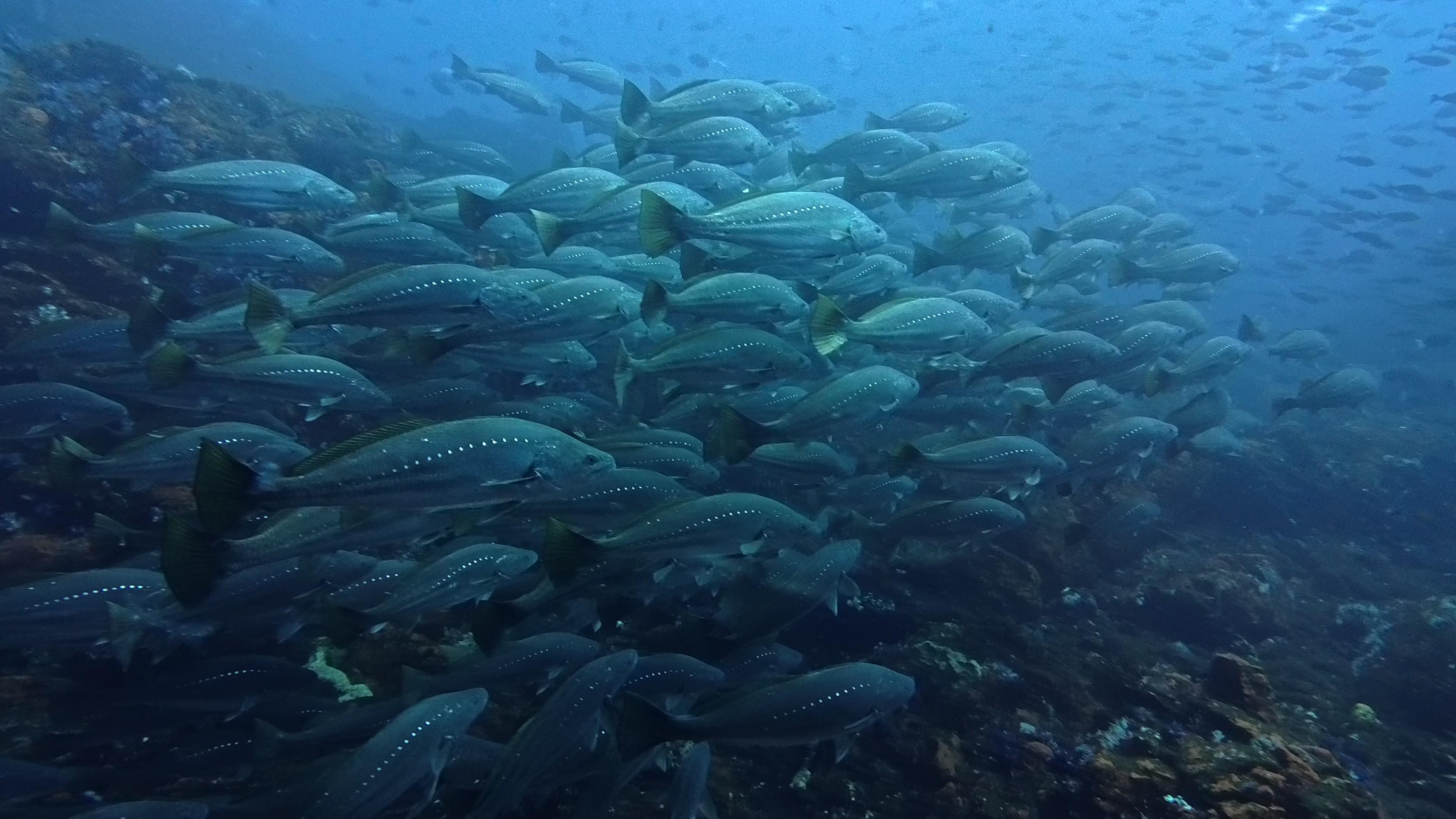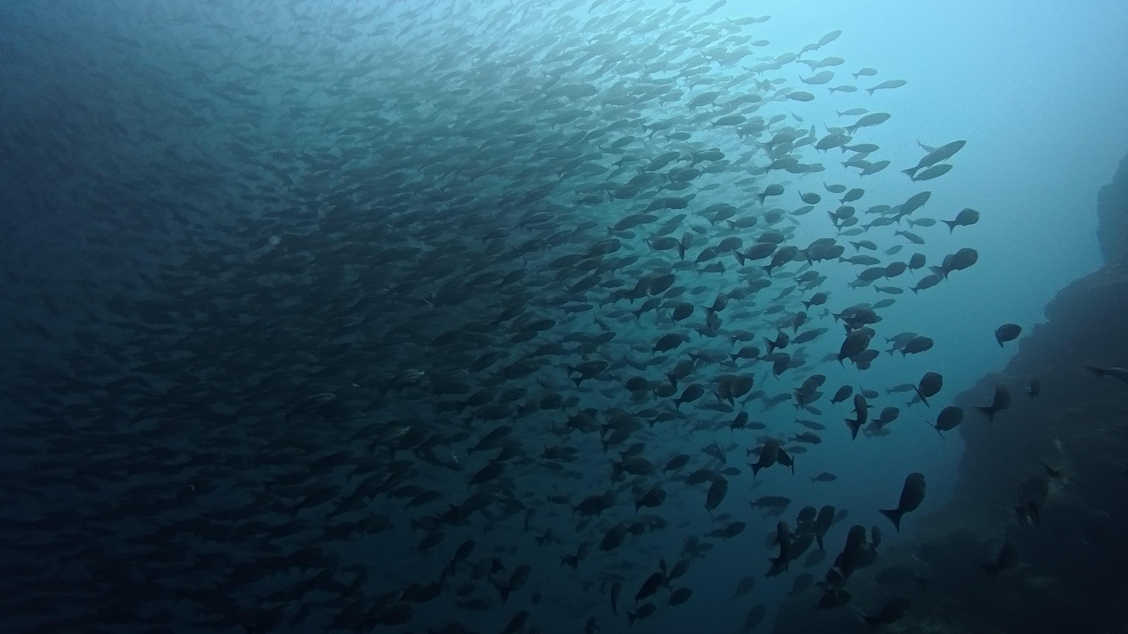 ぎゅっとしたイサキ群れが大きな壁となり、その上からはタカベ群れのシャワーが降り注ぎます。