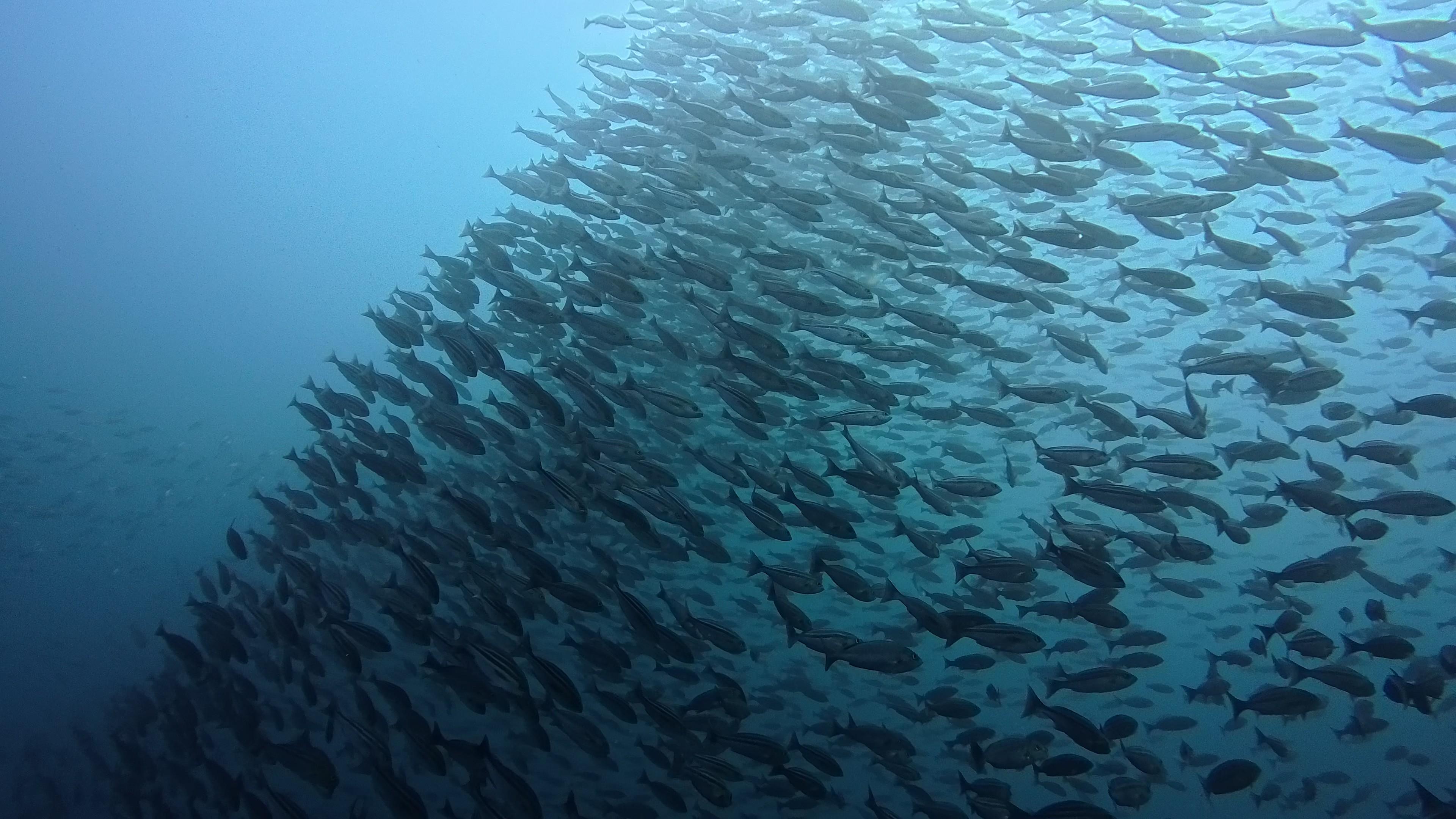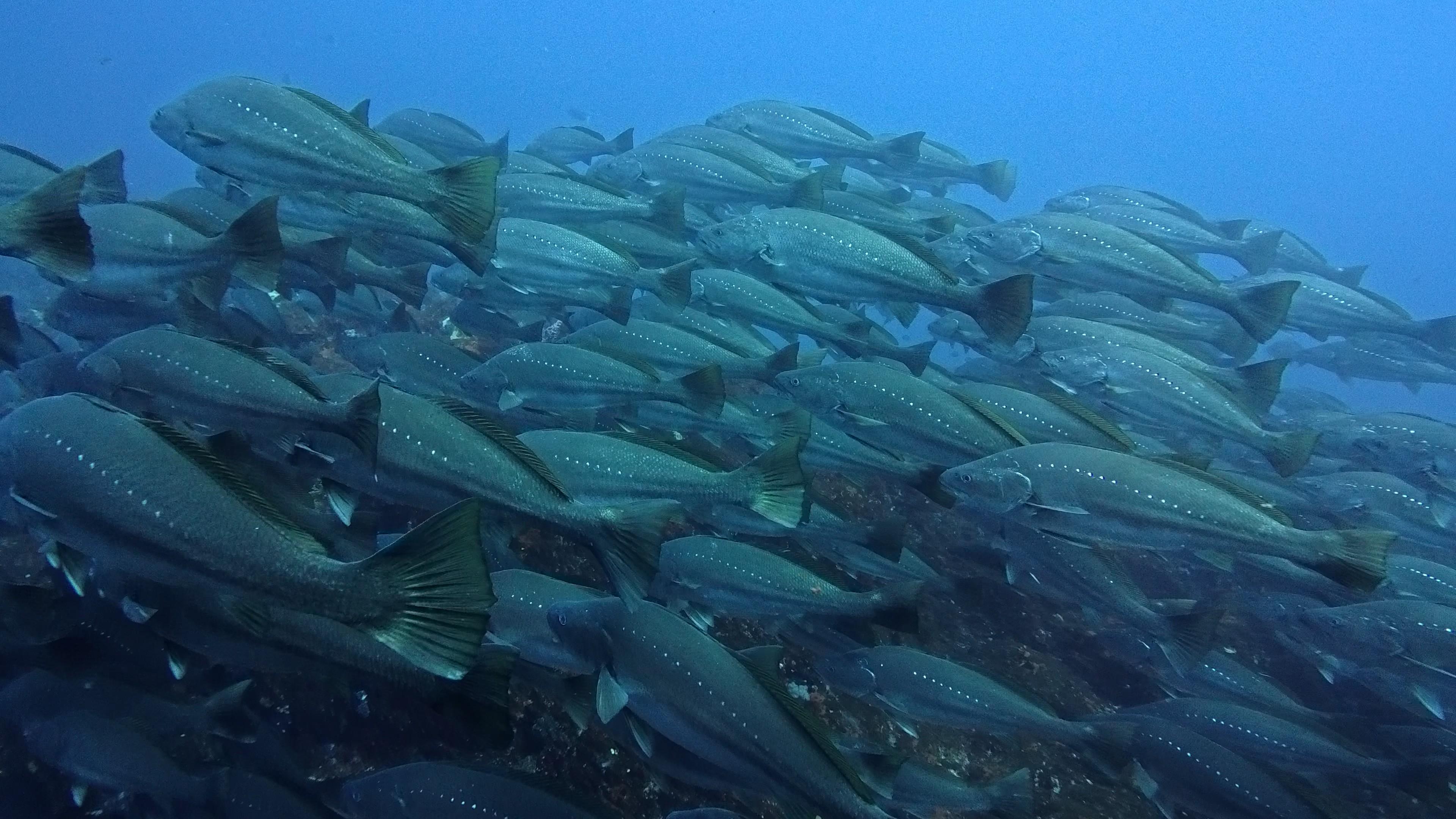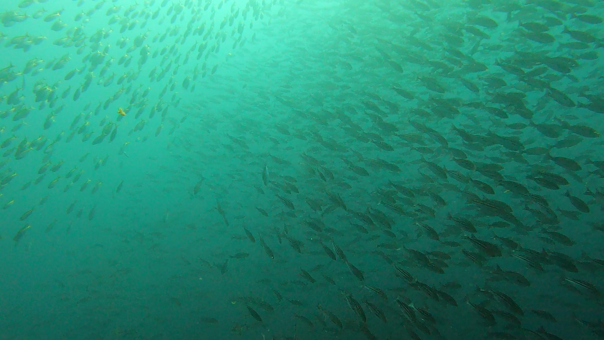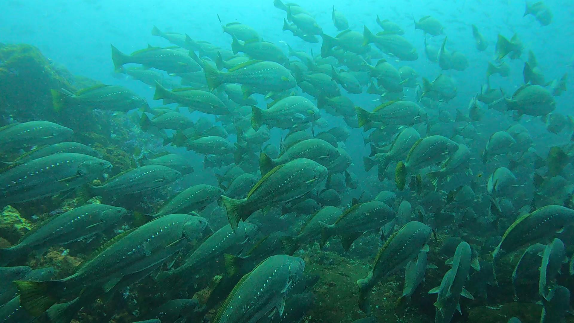 ぎゅっとしたイサキ群れが大きな壁となり、その上からはタカベ群れのシャワーが降り注ぎます。
