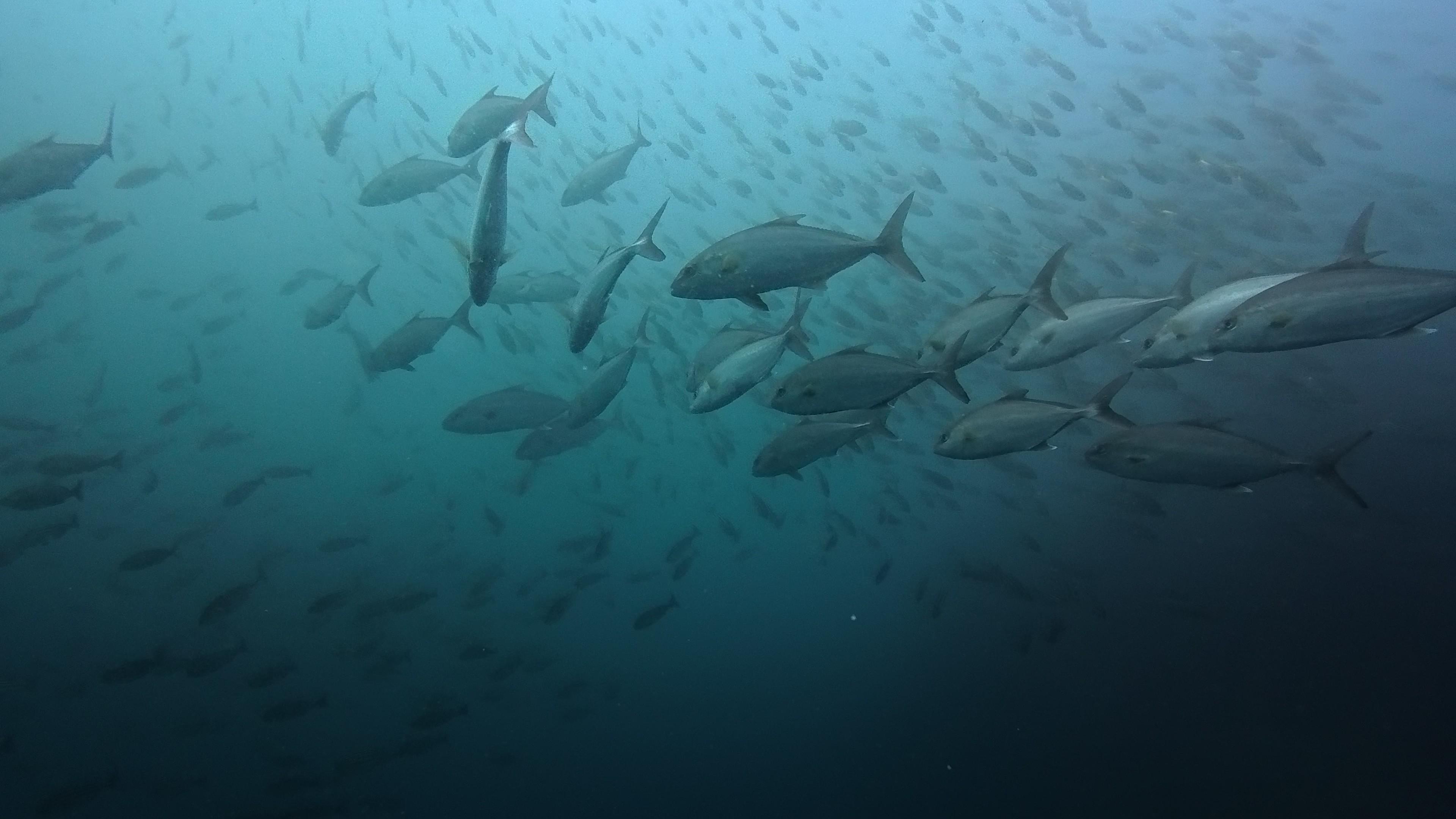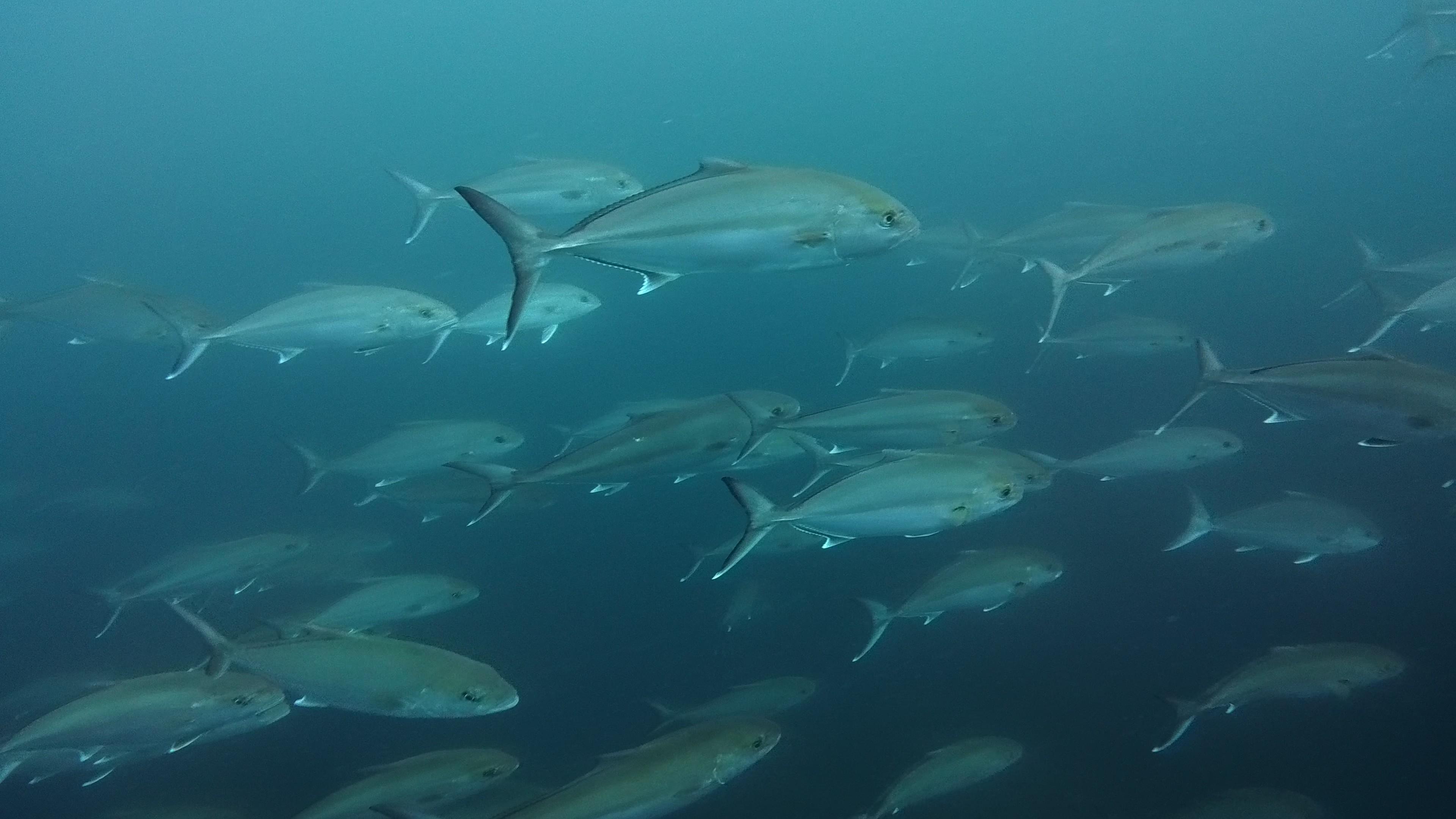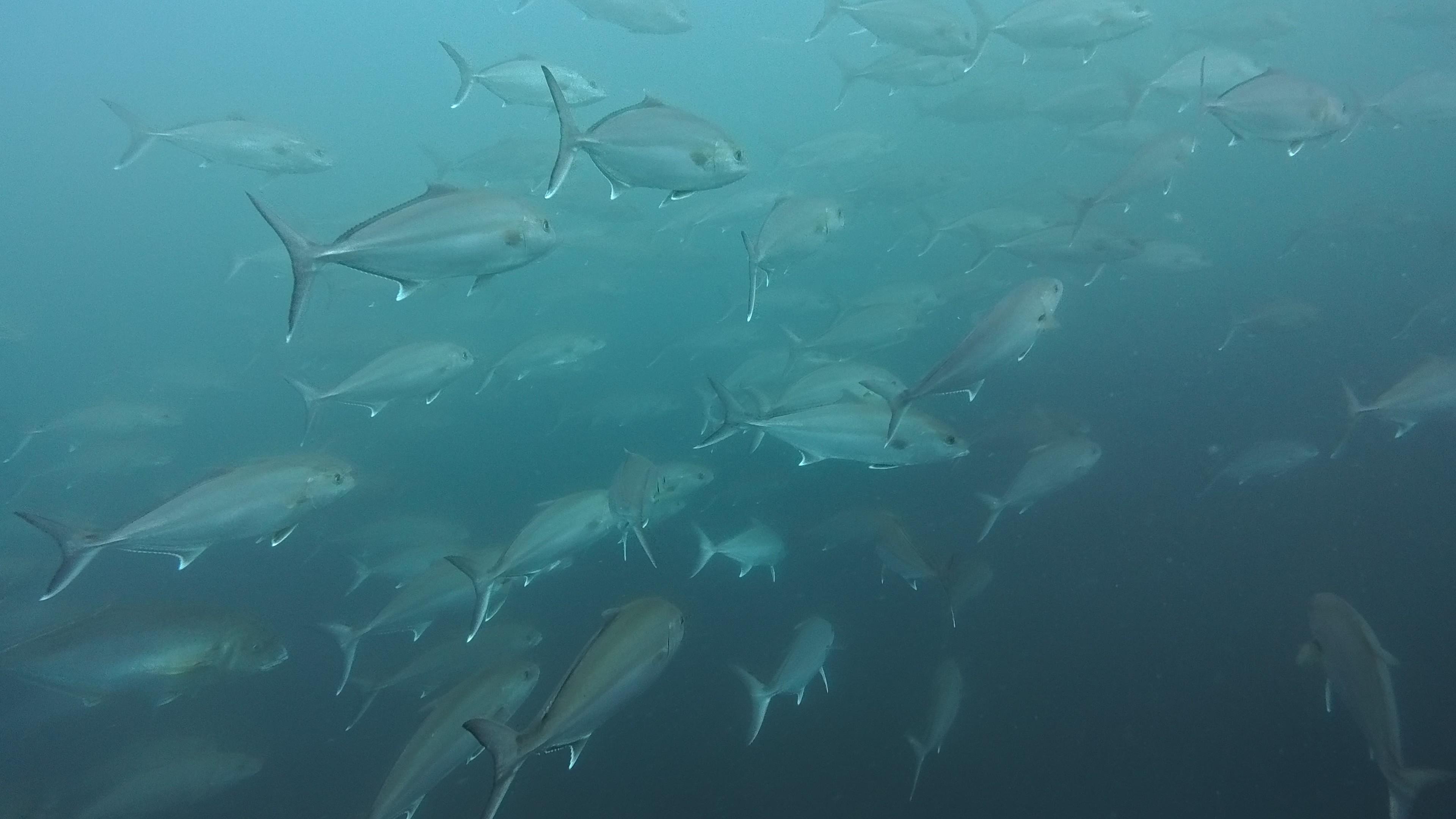 カンパチ群れの中に混ざる大きなシマアジ、これまた大きなクエなど、