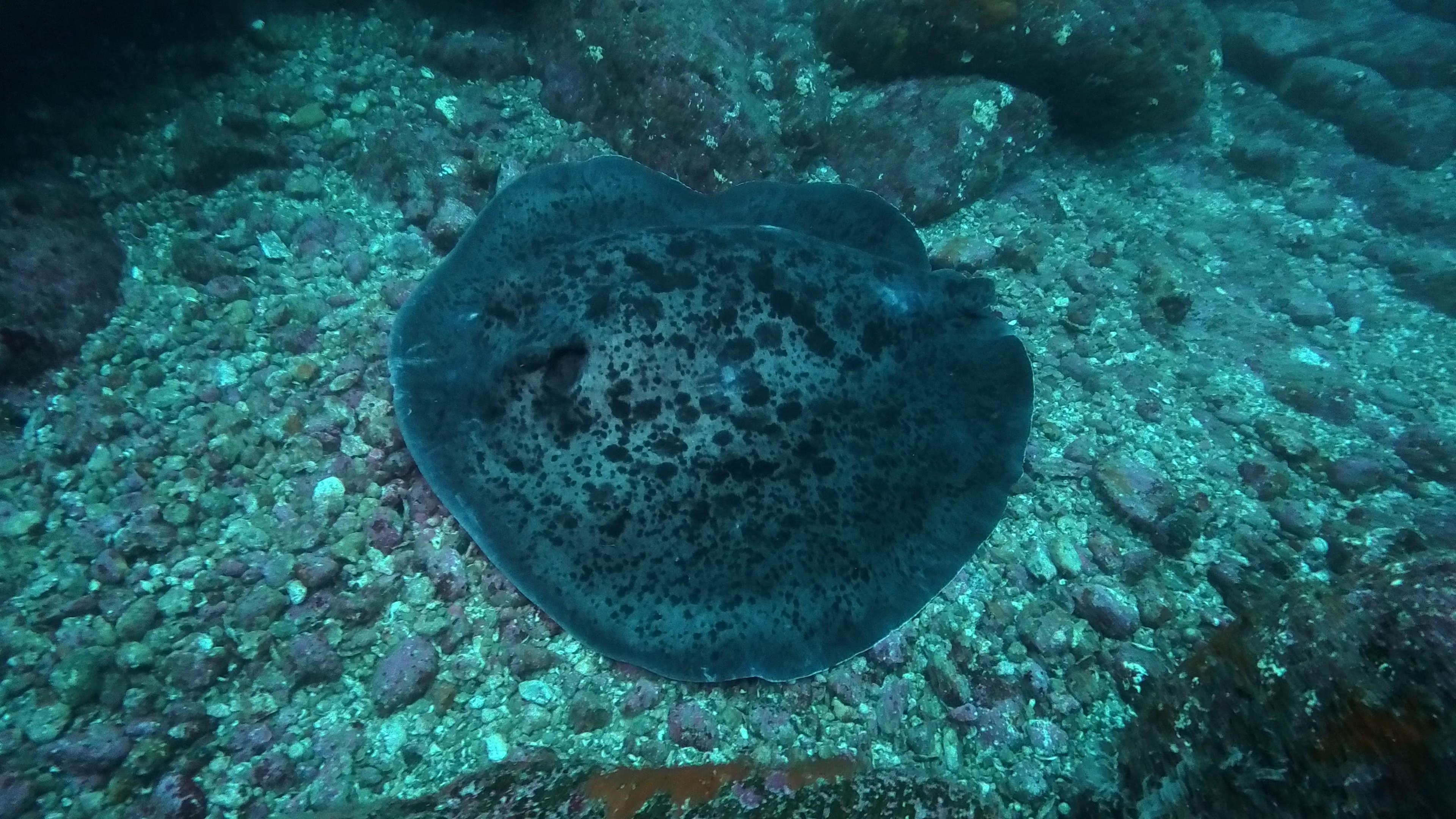 また、着底のマダラエイ、カンパチ群れと並走する大きなホシエイなどの底物も。