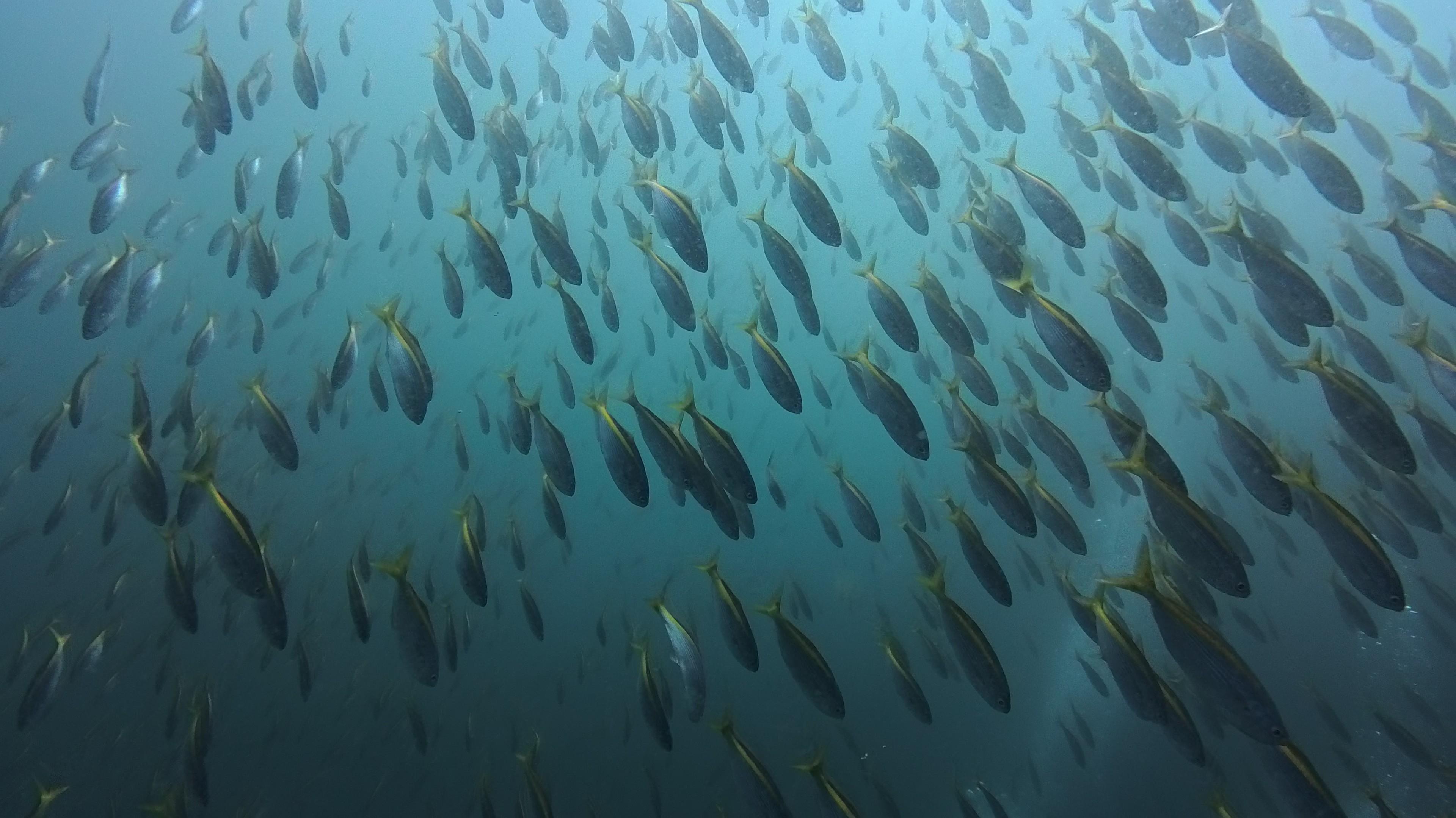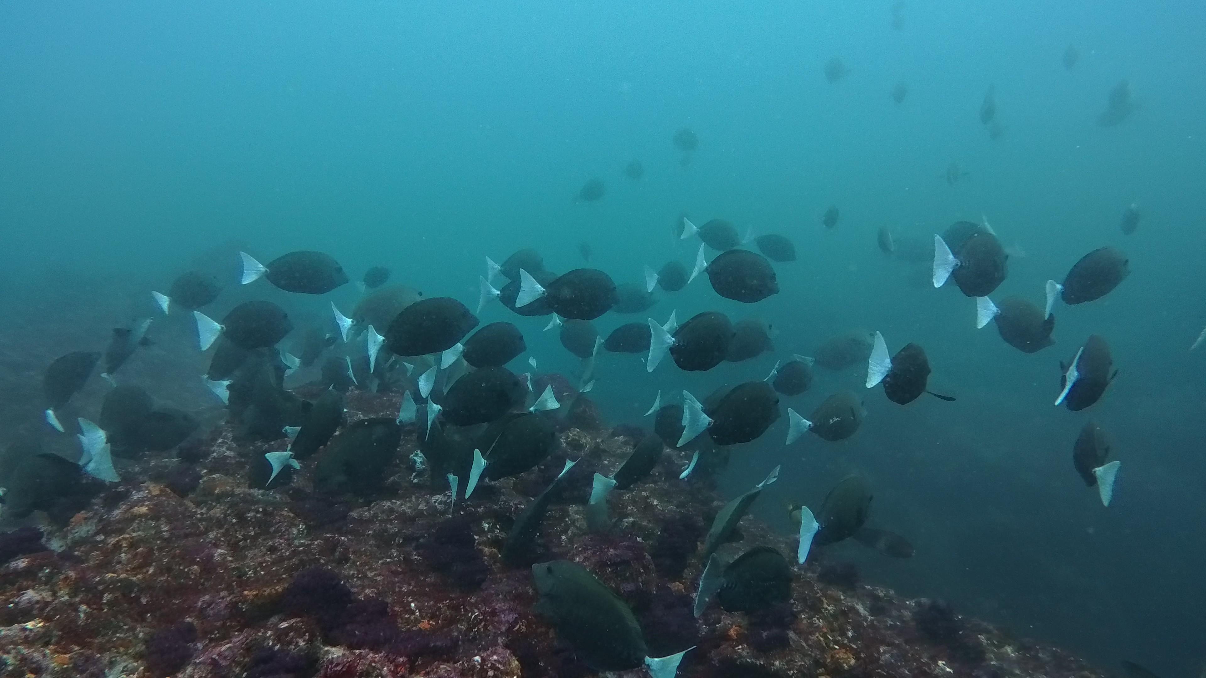 イサキやタカベの群れ、メジナやニザダイの群れの魚影を堪能できる透視度で、