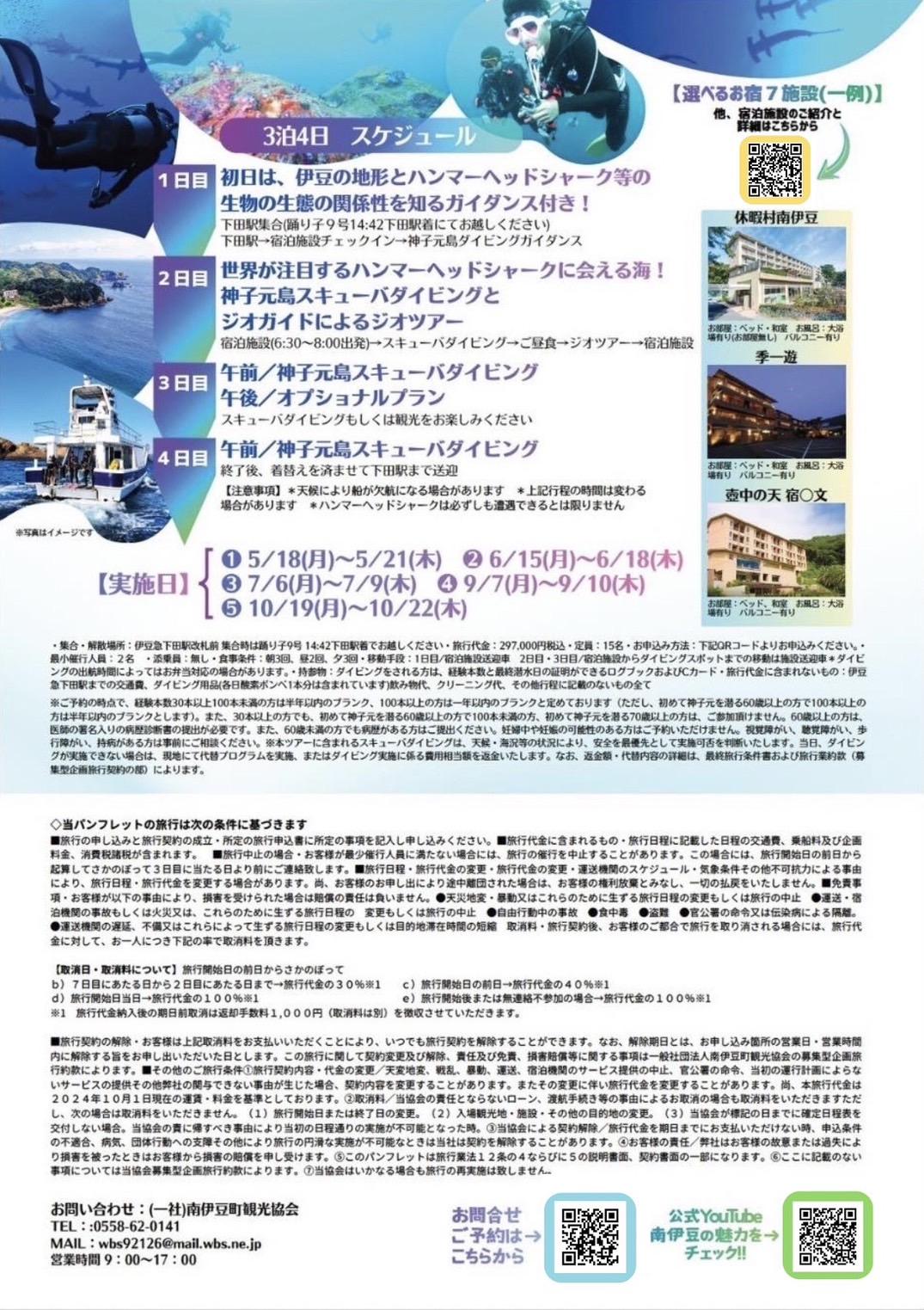 ・旅行代金に含まれないもの:伊豆急下田駅までおよび伊豆急下田駅からの交通費・ダイビング器材レンタル代・追加ダイブ料金・飲物代・クリーニング代・オプショナルプランに関する代金・その他行程に記載のないもの全て